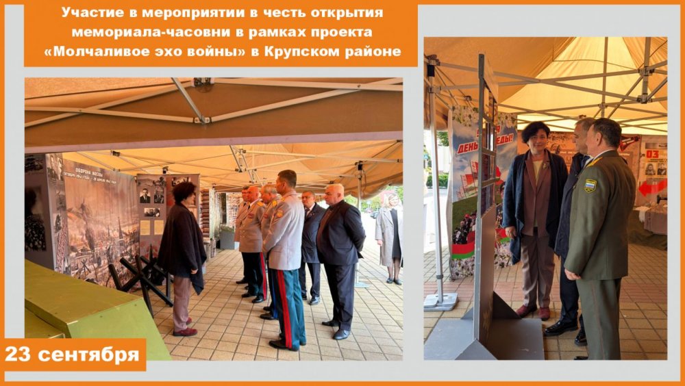 ГУ "Минский областной краеведческий музей" принял участие в мероприятии в честь открытия мемориала-часовни в рамках благотворительной программы «Молчаливое эхо войны» в Крупском районе. В местах наиболее ожесточенных сражений, проявлении фактов массового героизма в память о воинах устанавливаются мемориальные часовни. В данном проекте Крупки стали первым участником на территории Беларуси. Для гостей мероприятия был представлен выставочный проект "Дорогами Великой Победы", который вызвал неподдельный интерес у жителей г. Крупки и гостей. Такие мероприятия позволяют ощутить историческую связь между братскими народами Российской Федерации и Республики Беларусь, способствуя формированию чувства патриотизма и общекультурного наследия.