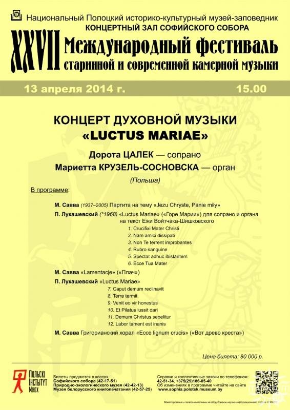 В канун страстной недели полочанам и гостям города польскую духовную музыку представят профессор Музыкального университета им. Фредерика Шопена, органистка Мариетта Крузель-Сосновска и ведущая солистка Дорота Цалек (сопрано). Концерт организован при содействии Польского института в Минске.